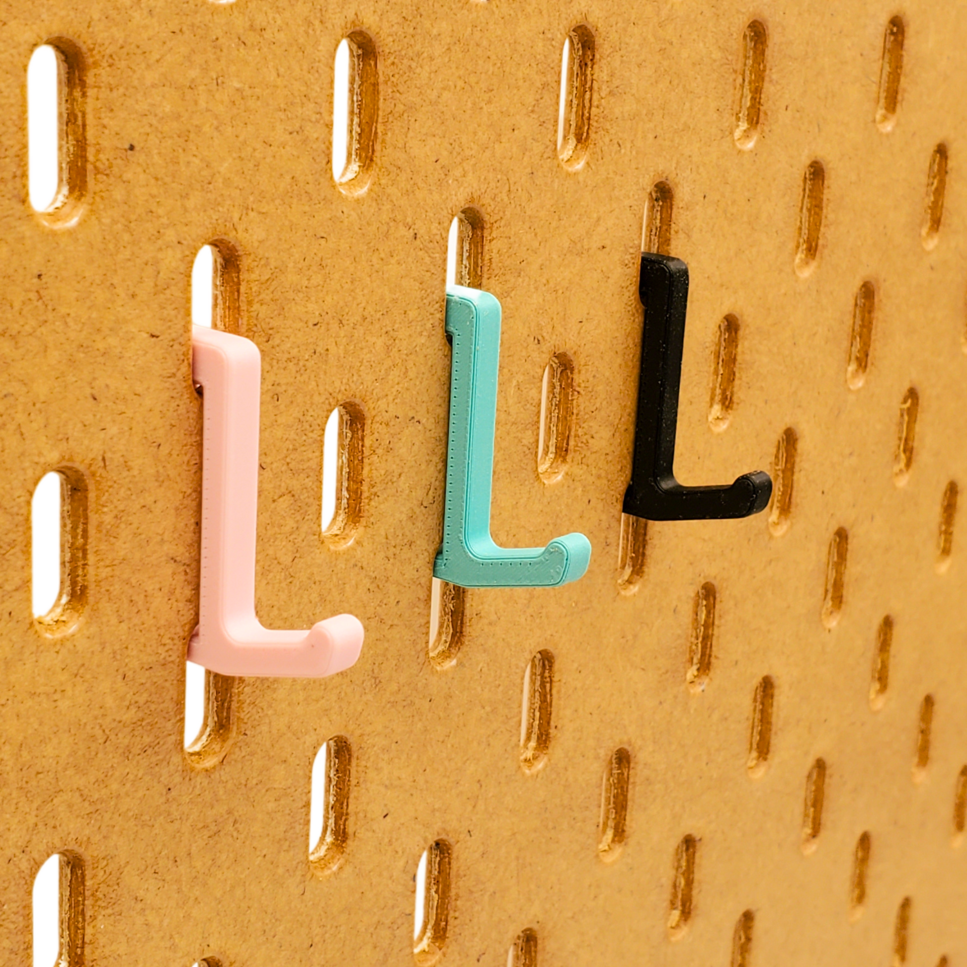Small 'LV' Hook perfect for your IKEA SKADIS organizational system! These hooks can be placed directly above one another to utilize even more of your pegboard space, while still maintaining an anti pull-out feature to prevent the hook from accidentally coming off the board while hanging your tools or products.