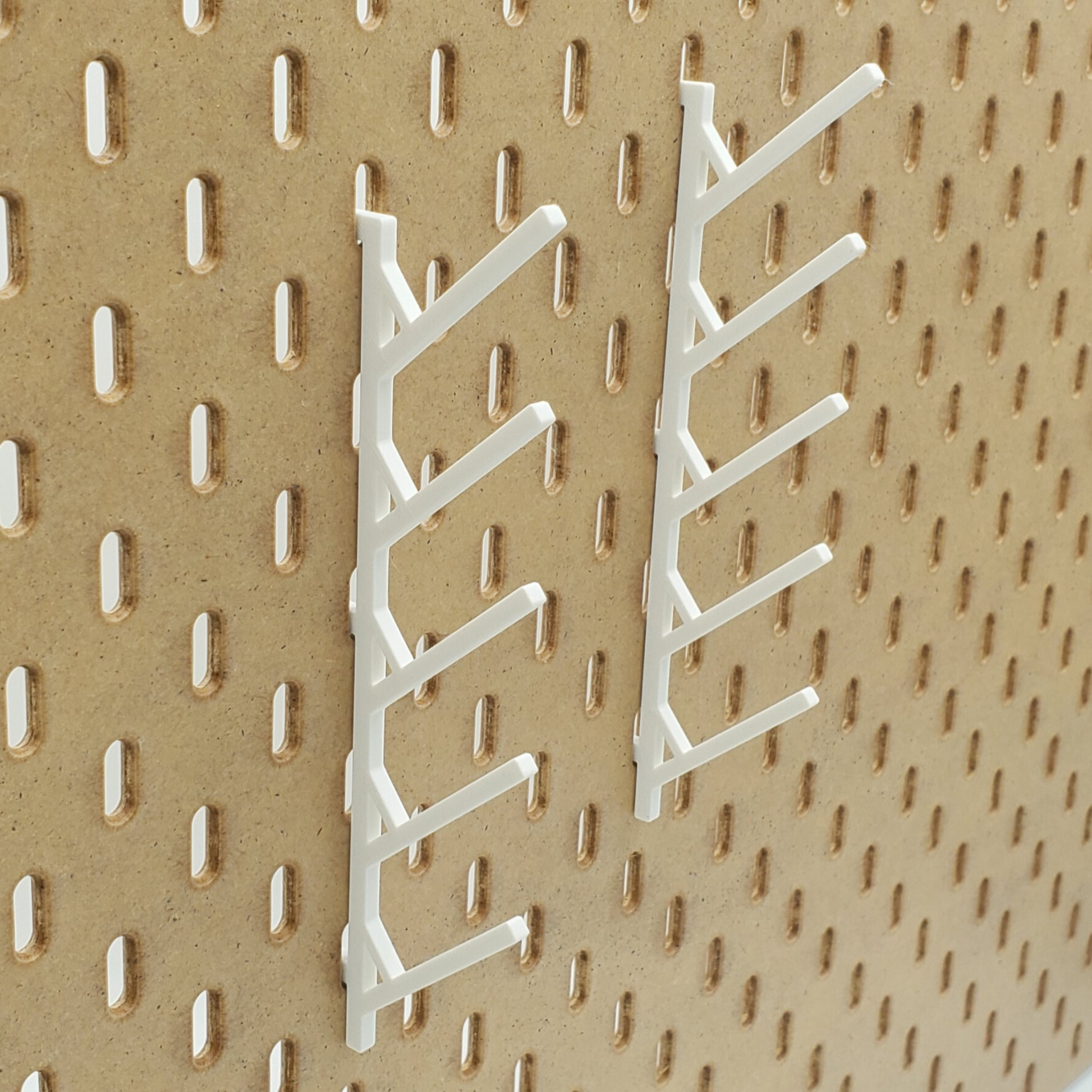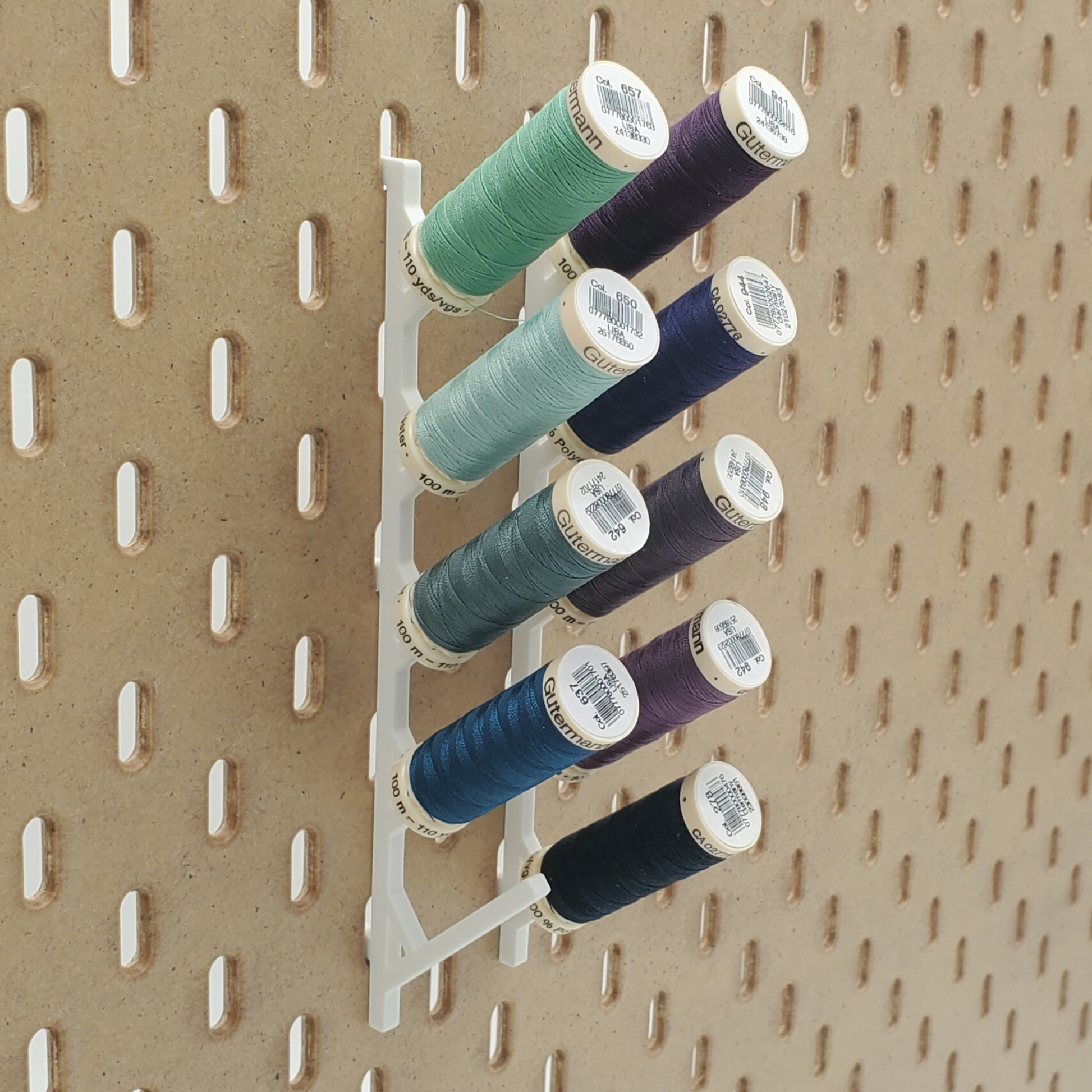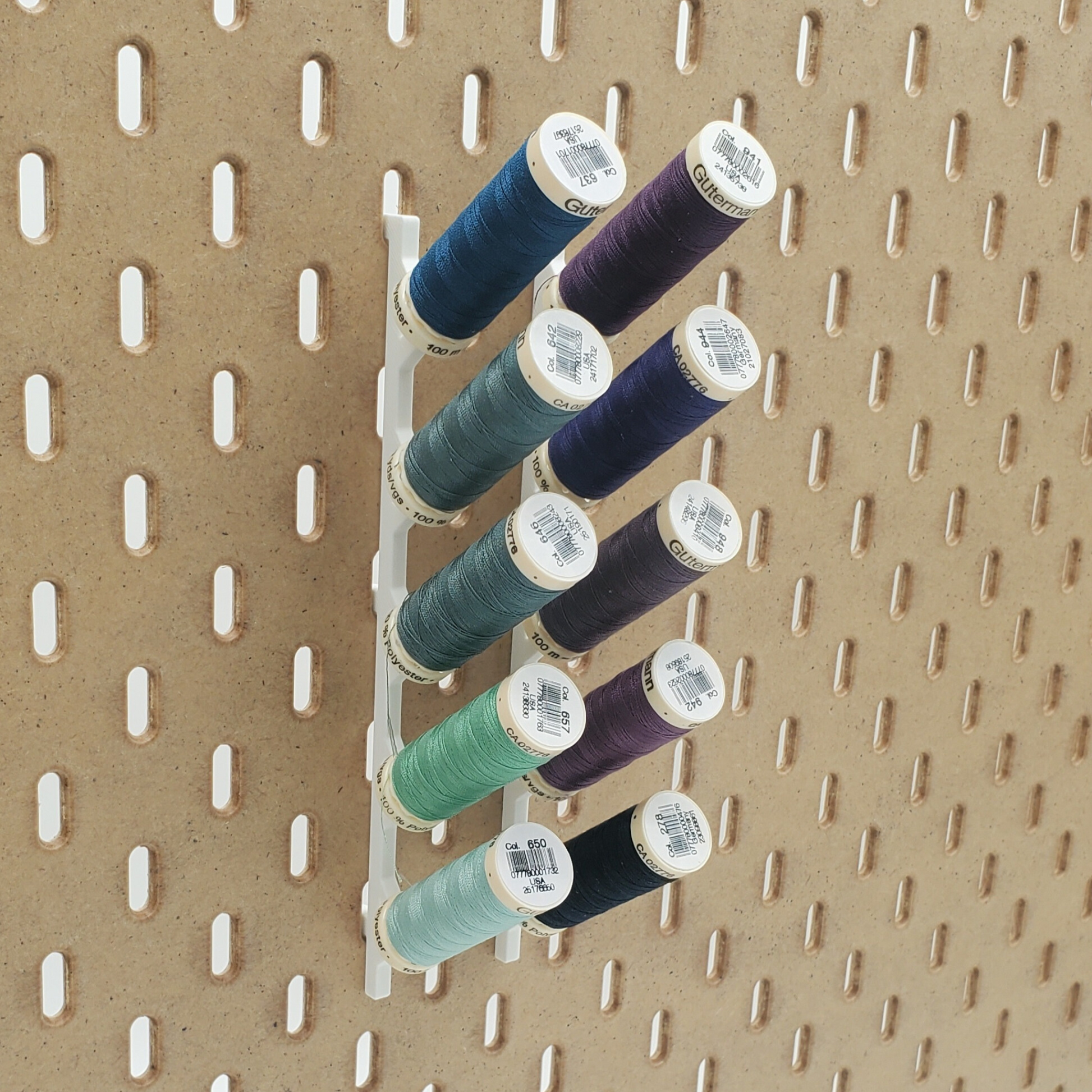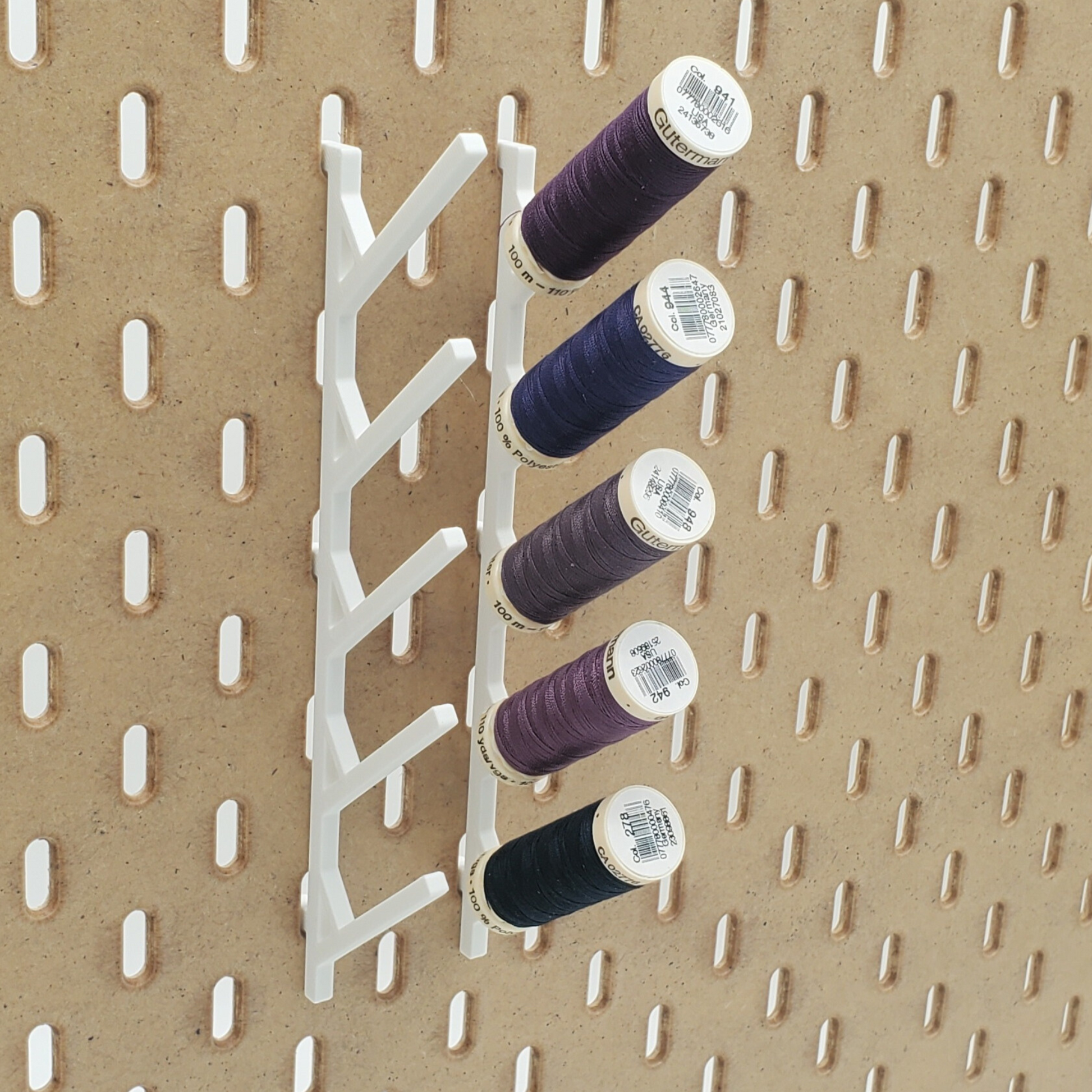 Thread holder hooks perfect for your IKEA SKADIS! Perfect for capturing thread, and looking sleek while doing it! These hooks can be placed directly above one another to utilize even more of your pegboard space!