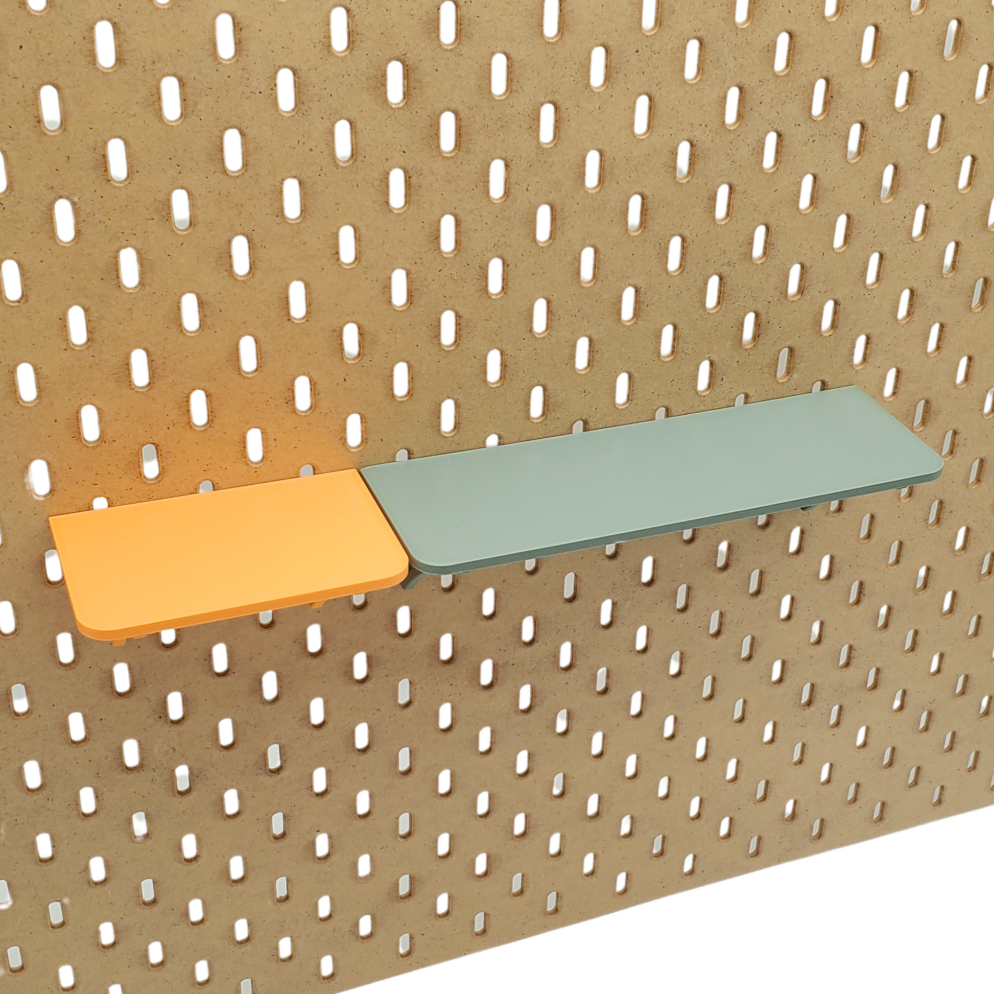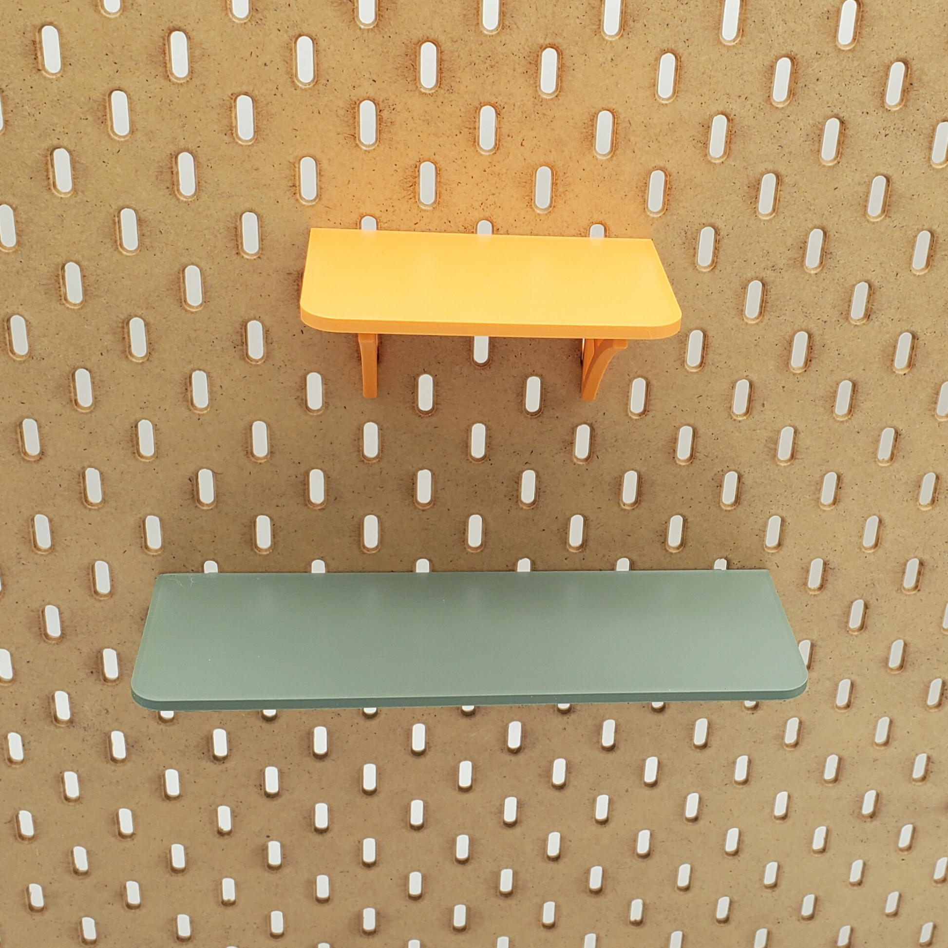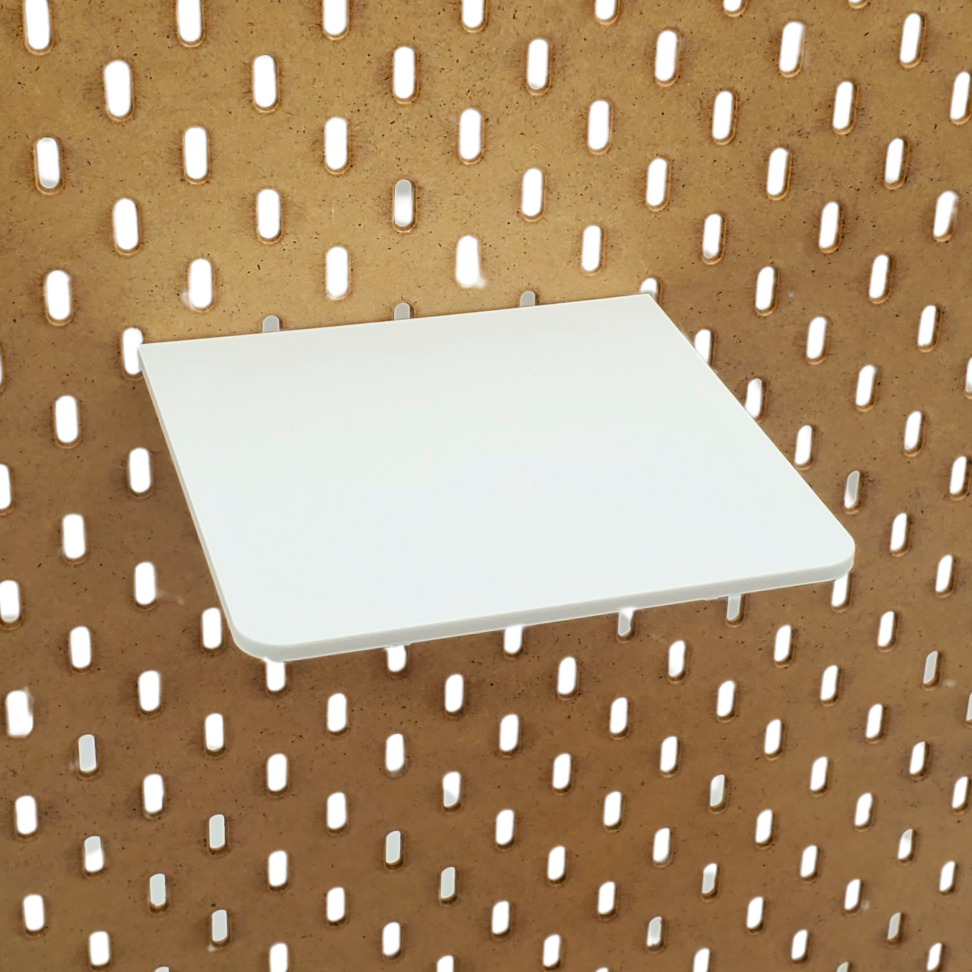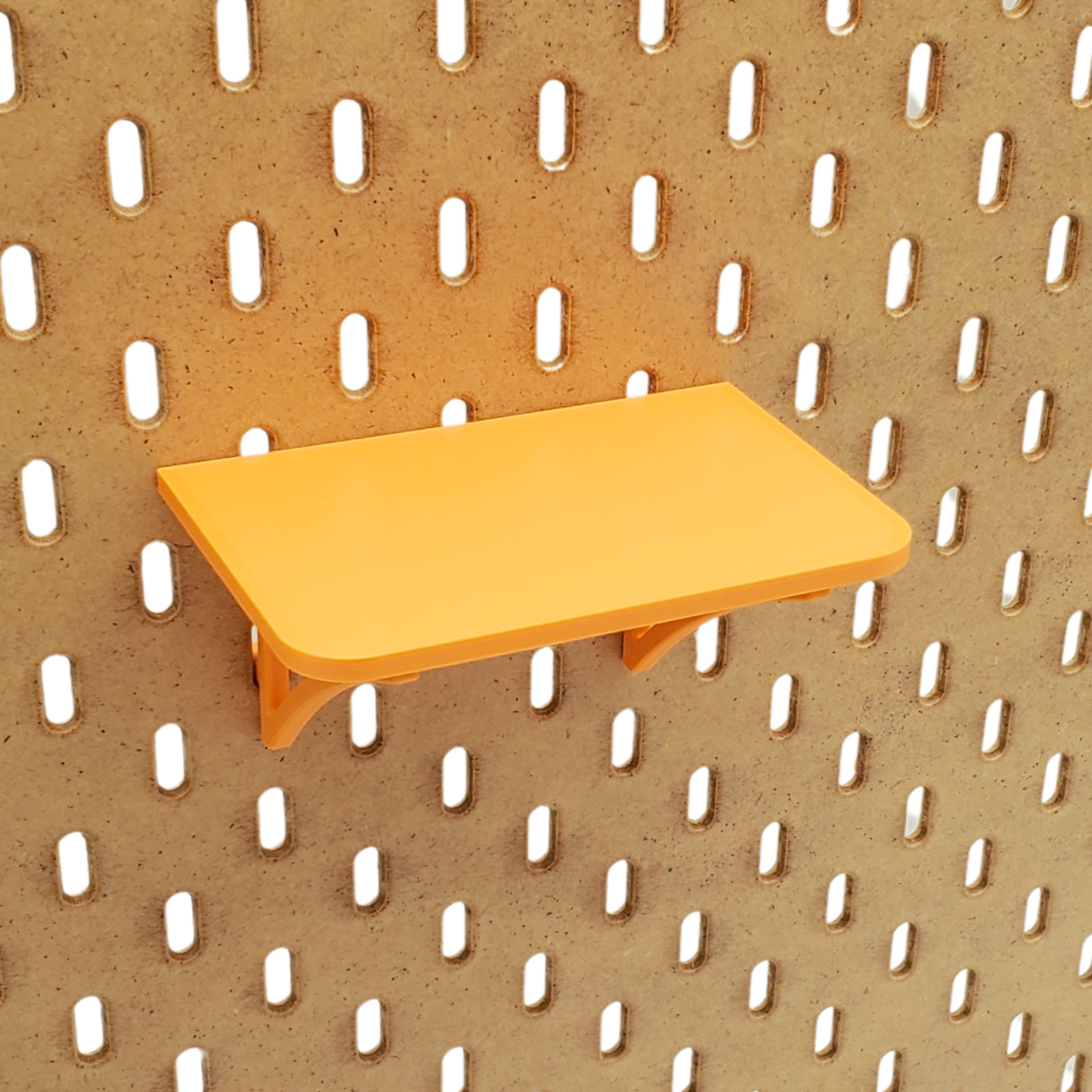 Storage shelves for your IKEA SKADIS board keeps you organized! A flat desk seems to accumulate all of our items, now, we can populate flat surfaces on the wall as well! These shelves are perfect for displaying all your wonderful crafts and tools, and while matching the color of your other SKADIS accessories!
