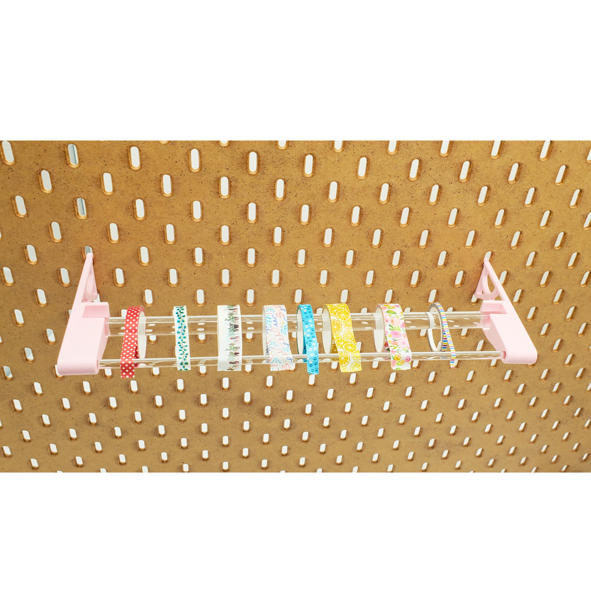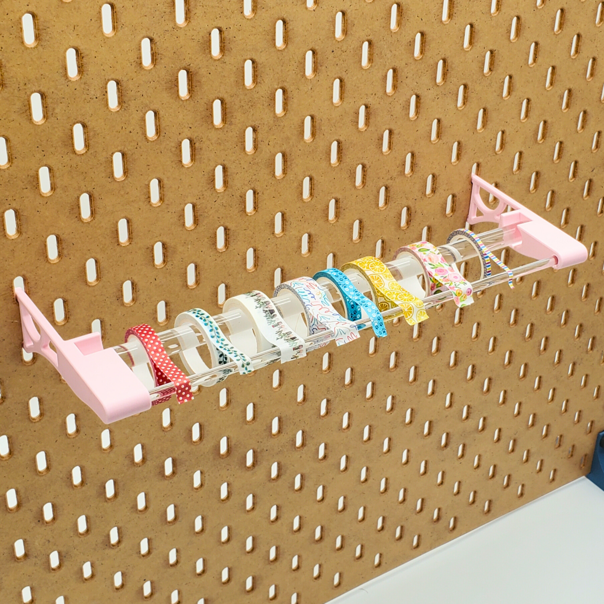Another 'Just Hanging' Product! Washi Tape Display for your SKADIS! Elegant hooks keep an acrylic rod suspended to showcase all those wonder tape options! Rod is set into place via a curved path to make accidental lift-off less likely! A small acrylic rods sits in front to provide a place to hang your tape ends! This keeps you from hunting the end when your ready to use it!